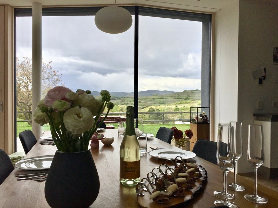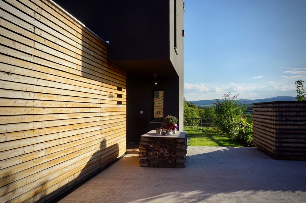 Durch die steile Hanglage bietet sich diesem Haus ein beeindruckender Blick in die Weinberge des Kremstales. Quer zum Hang gestellt folgt der Baukörper mit einem leichten Knick dem Verlauf des Geländes und terrassiert das Grundstück wie einen Weingarten. durch die auf zwei Ebenen liegenden Terrassen und die zentrale Platzierung des Hauses am Grundstück bilden sich zwei getrennte Gartenbereiche.