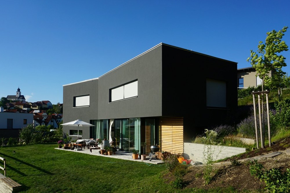 Das Haus mit dunkler Fassade birgt innen einen hellen weichen gerundeten Kern aus Stiege und Kamin, der die Ebenen offen miteinander verbindet. Über eine weit gestreckte raumhohe Glasfront im Erdgeschoß ermöglicht der tiefe Ausschnitt den Blick ins Grüne, der die Grenze zwischen innen und außen verschwinden lässt.
