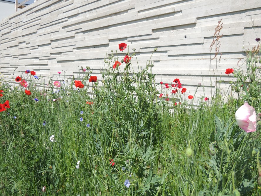 Die vollkommen eingeschüttete Garage ist auch von der Straßenfront durch das in die Lärchenholzverkleidung integrierte Garagentor kaum wahrnehmbar.