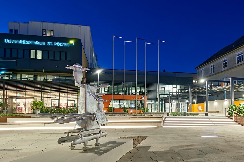 Der Dunant-Platz ist strahlenförmig Richtung Haupteingang des Universitätsklinikums konzipiert und ermöglicht sowohl die Wegführung und Anbindung an den öffentlichen Raum, als auch einen speziellen Ort für eine Skulptur von Bruno Gironcoli, sowie einen Platz zum Verweilen und zur Kommunikation. Die durch Bäume beschatteten Sitzelemente nehmen das Motiv der 3D-Fassadenelemente von Haus C auf. Begleitend führt eine überdachte behindertengerechte Rampe von der Propst-Führer-Straße zum Haupteingang.