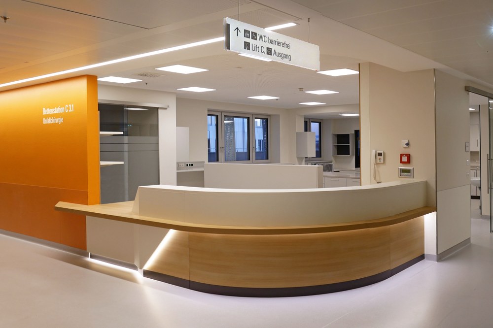 Der Bettentrakt beinhaltet in den Ebenen E3 bis E5 Allgemeinpflegestationen mit 84 Betten je Ebene. Der Pflegestützpunkt als Anlaufstelle wurde als offenes Pult ausgeführt und mit den Arbeitsplätzen der Pflege als große offene Einheit gestaltet.