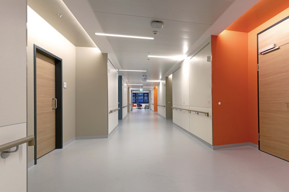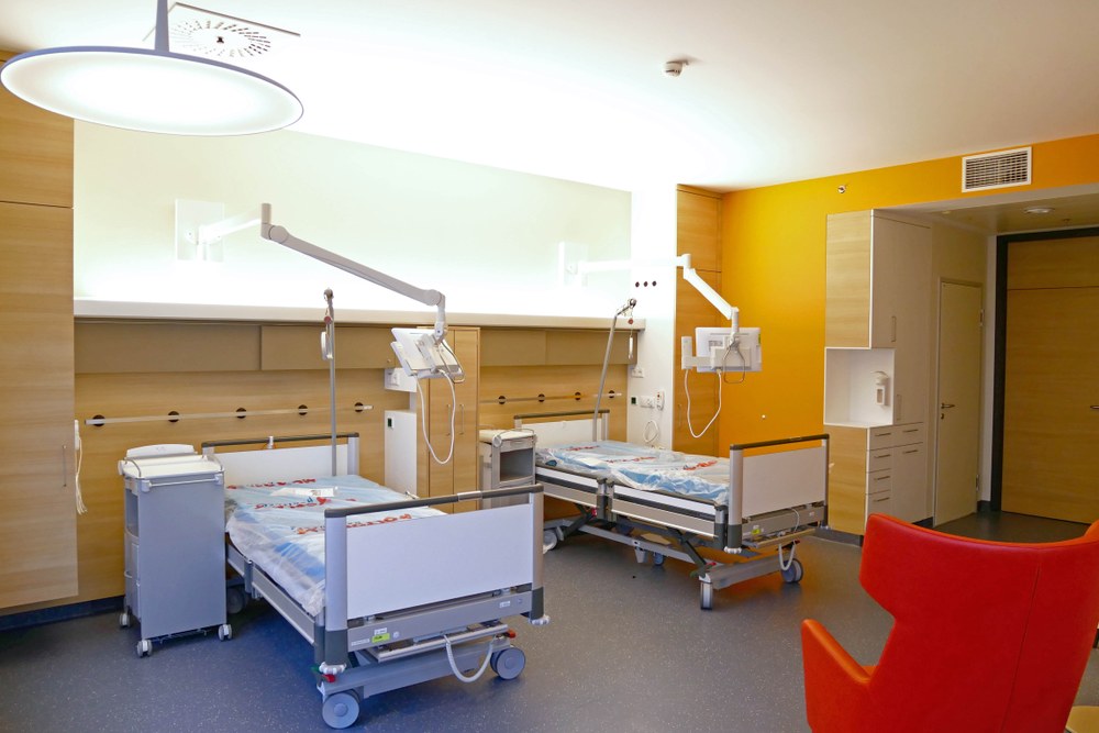 Die Patientenzimmer sind mit großen Fensterfronten mit Niedrigparapethen ausgestattet, die auch als Sitzfläche dienen. Die Fensterlaibungen wurden mittels Holzverkleidung aufgewertet und stellen ein starkes gestalterisches Merkmal dar. Die Grundfarben Eiche, Weiß und Fango wurden durch punktuell eingesetzte Wandfarben bzw. Sesselbezüge durchbrochen. Die Gangnischen sind farblich als Orientierungshilfe und zur Gangverkürzung in differenzierter Farbgebung gestaltet und mittels Lichtgestaltung zusätzlich akzentuiert.