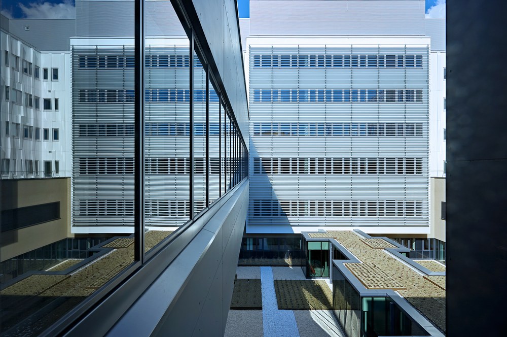 Die Hochmedizin, in der Ebene E2 verortet, umfasst die Bereiche Intensivpflege mit 36 Betten und den Zentral-OP-Bereich mit 10 OP-Sälen.