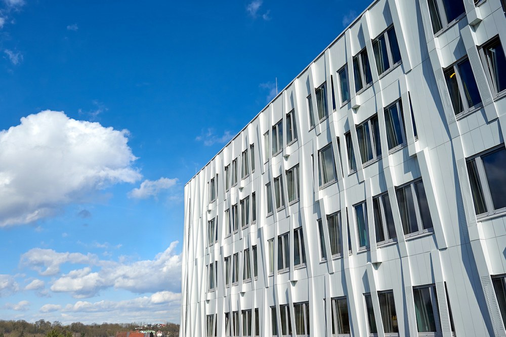 Die Fassade lässt die funktionelle Gliederung des Hauses in der Gestaltung wiedererkennen. Der zweigeschoßige Funktionstrakt vermittelt Erdverbundenheit durch eine fugenlose Putzfassade mit warmer Farbgebung. Als Gegenpol dient die Gestaltung des Bettentraktes mit einer weißen, glatten Aluminiumverbundplatten-Fassade mit einer vertikalen Modulbreite von 45 cm. Kombiniert mit 3D-Elementen, die ein markantes Wechselspiel von Licht und Schatten über den Tagesverlauf generieren.