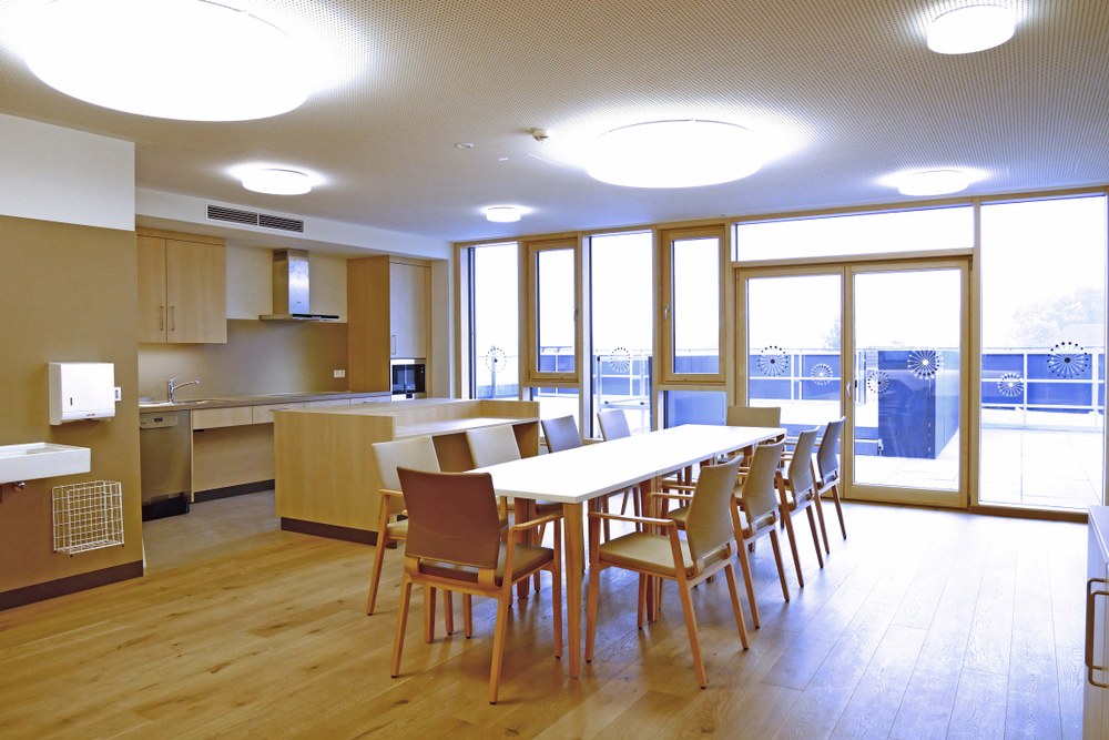 In der Verbindung der beiden Baukörper liegt die Kernzone. Hier befinden sich der Haupteingang und die Aufenthaltsbereiche für die Bewohner.