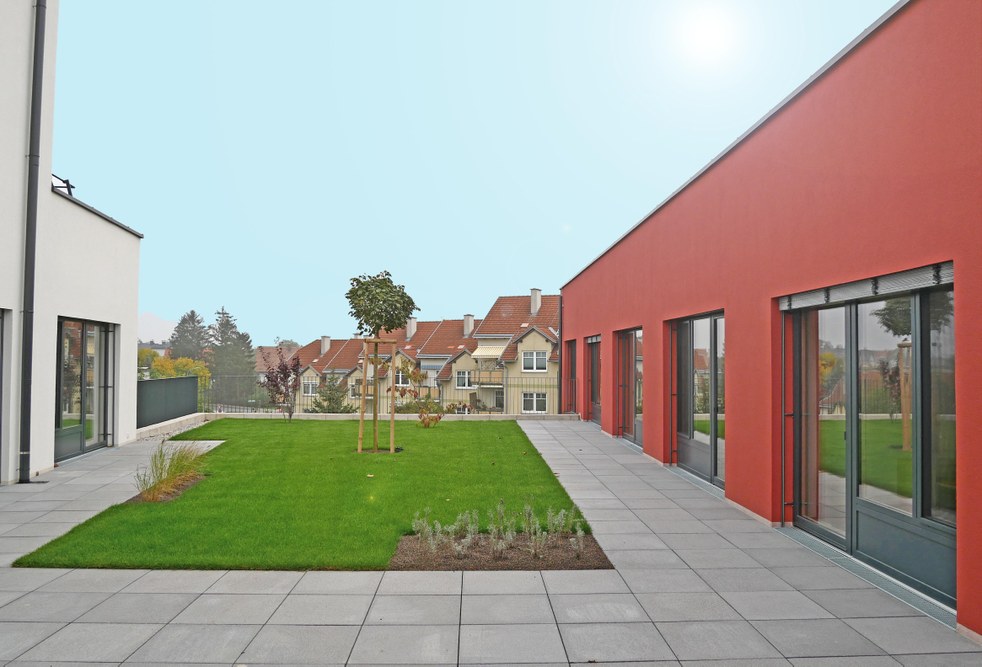 Durch diese Situierung der Baukörper entstehen unterschiedliche Erlebniswelten, wie ein introvertierter, ruhiger und schattiger Innenhof, als auch eine extrovertierte vorgelagerte sonnige Terrasse.