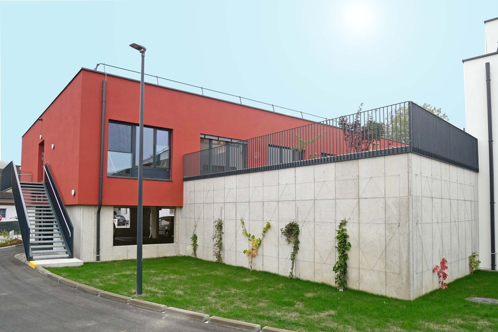 Der 3-geschossige nördliche Baukörper ist in Weiterführung des Bestandsgebäudes situiert, der 1-geschossige südliche Baukörper in Richtung Osten gedreht. Dadurch entsteht ein sich öffnender Innenhof.