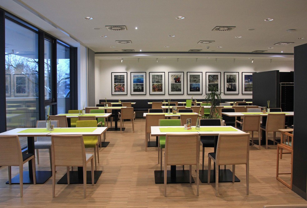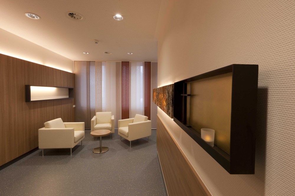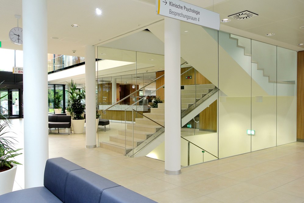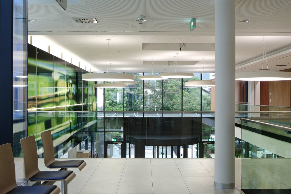 Die zweigeschossige Eingangshalle mit Information, offener Cafeteria und Shops im Erdgeschoss als lichtdurchfluteter Knotenpunkt zwischen Alt und Neu, Ambulanzbereich und Bettentrakten. Im Obergeschoss sind patientennah die Physiotherapie sowie der Veranstaltungs- und Seminarbereich positioniert.