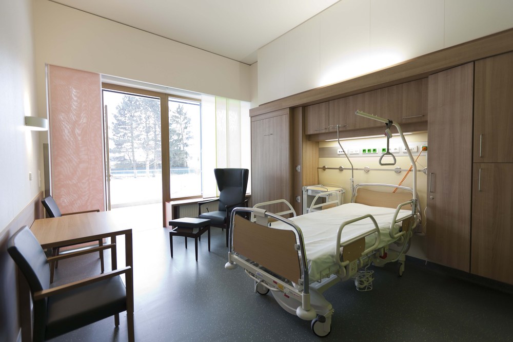 In der Ebene E1 wurde aufgestockt und befinden sich der Intensivbereich (8 Betten), sowie eine Palliativ- (8 Betten) und Sonderklassestation (12 Betten) mit jeweils vorgelagerten, überdachten Veranden, sowie einem gemeinsam nutzbaren Dachgartenbereich.
