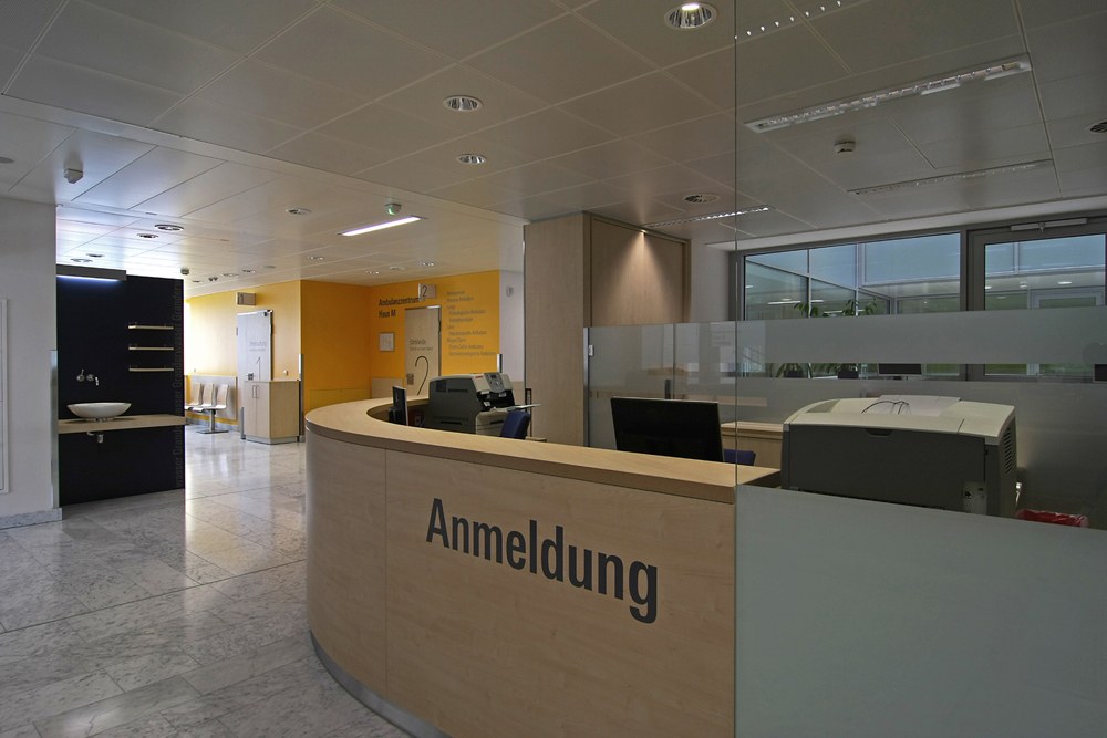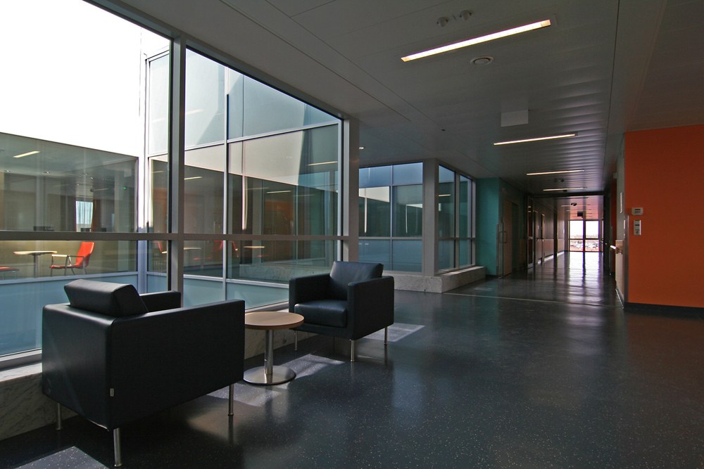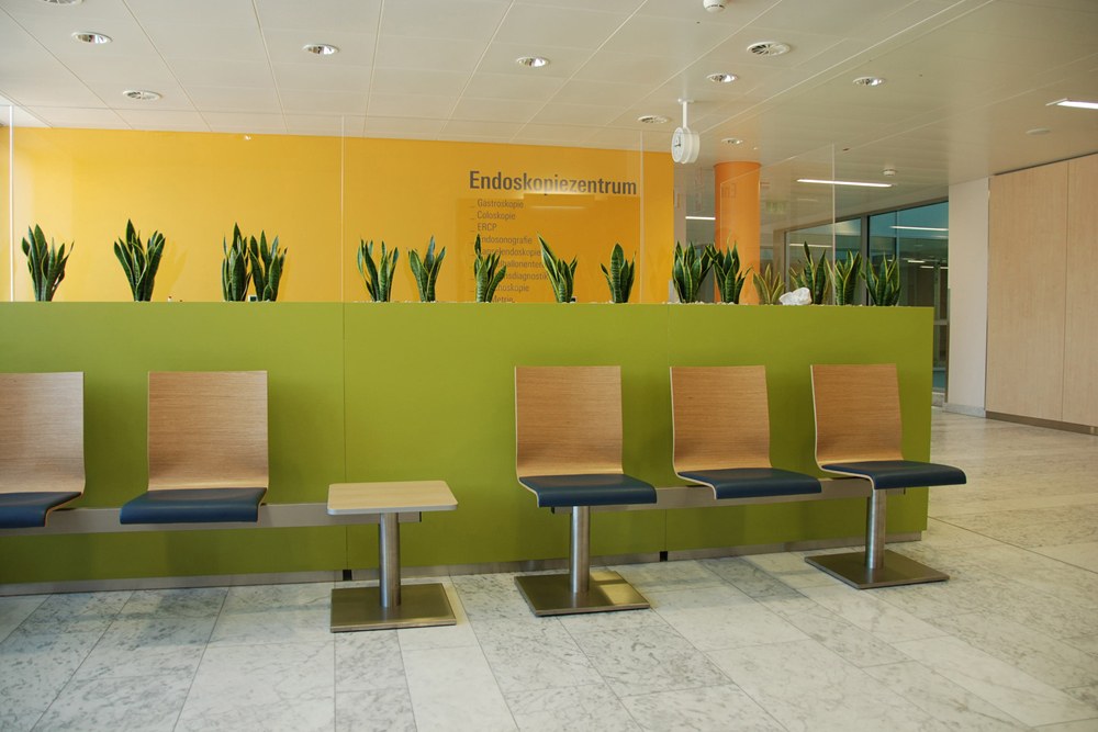 Die innere Gebäudebelichtung erfolgt durch 2 zentral liegende Atrien, den Bettenstationen sind 2 kleine Patiententerrassen zugewiesen.
