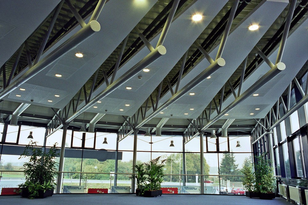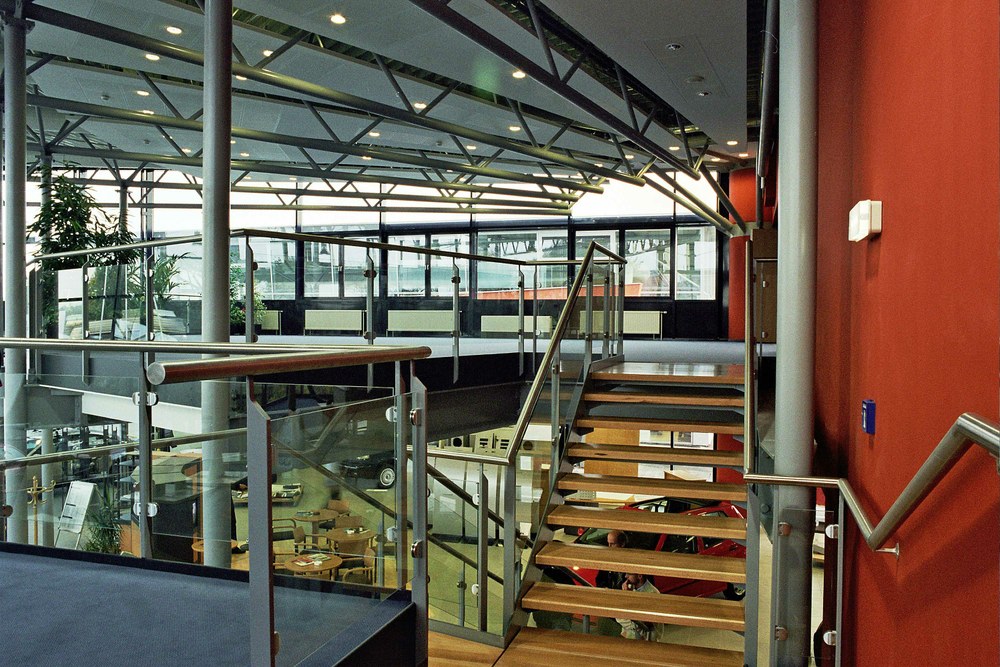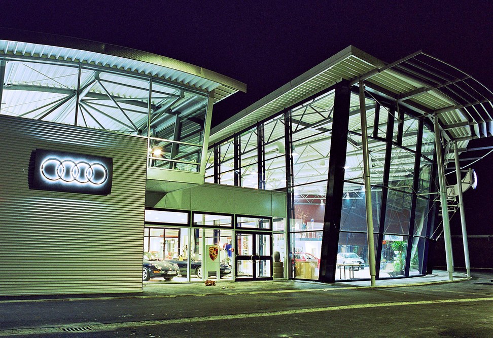 Der großvolumige Baukörper gliedert sich entsprechend den Funktionen in einen 2-geschoßigen Verkaufsbereich mit Administration und Zentrallager, einem Werkstättentrakt sowie etwas abgesetzt einen 2-geschoßigen "Hangar" für die Marke Audi.