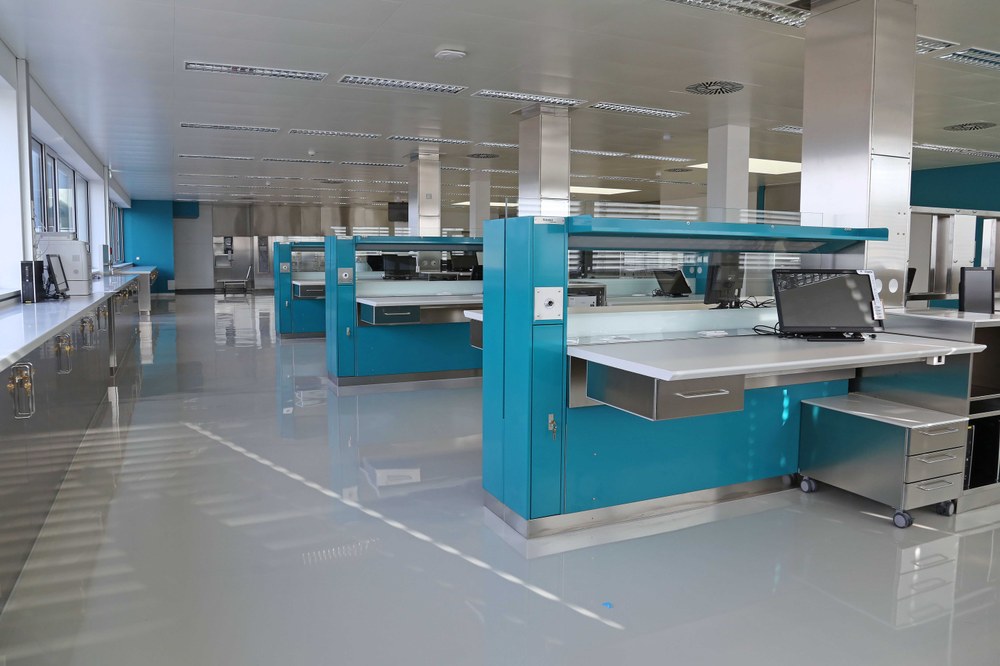 Die Ebene E1, Nord-Süd orientiert, beinhaltet Büroräume für Materialwirtschaft, AEMP, Apotheke und eine Produktionsapotheke mit Reinraumbereichen.