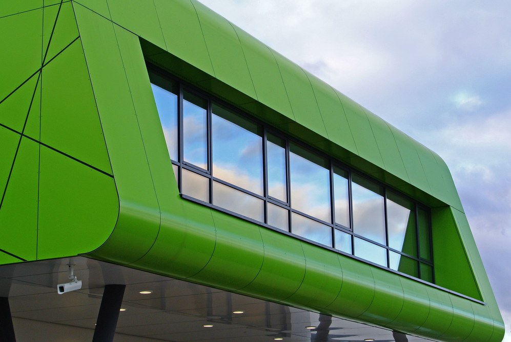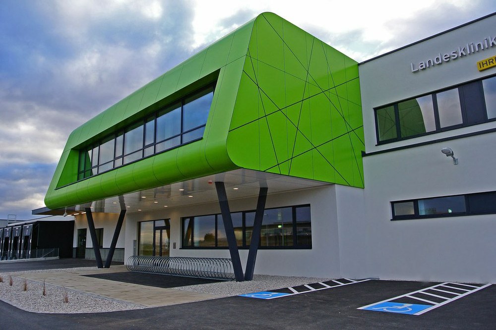 Der markant auskragende limonengrüne Baukörper markiert den Eingangsbereich des Logistikzentrums und unterstreicht die Gliederung der Fassade durch die Wahl von verschiedenen Materialien, begründet durch die unterschiedlichen Funktionen von Lager- und Verwaltungsbereichen.