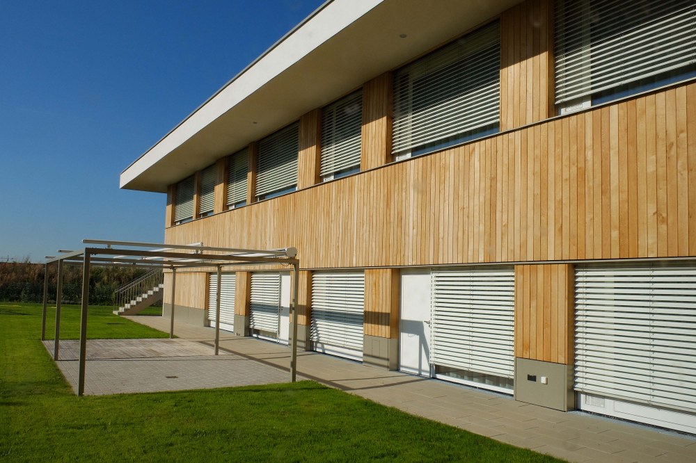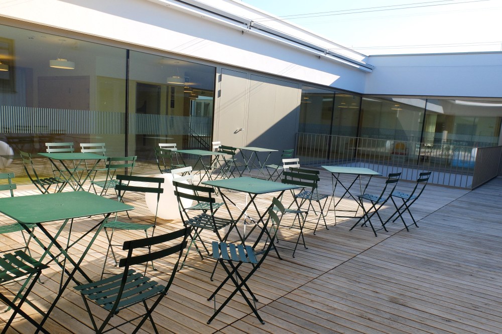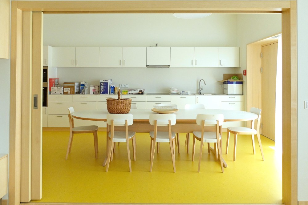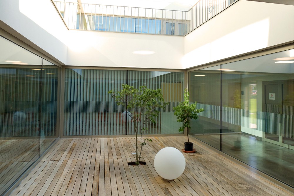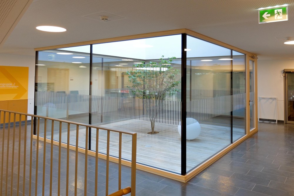 Die Tagesstätte beherbergt 3 Schulklassen sowie einen öffentlichen Kindergarten für 2 Gruppen. Durch raumhohe Fensterflächen und zwei große Atrien in den Obergeschoßen entsteht ein lichtdurchflutetes Bauwerk mit starkem Bezug zur Umgebung.