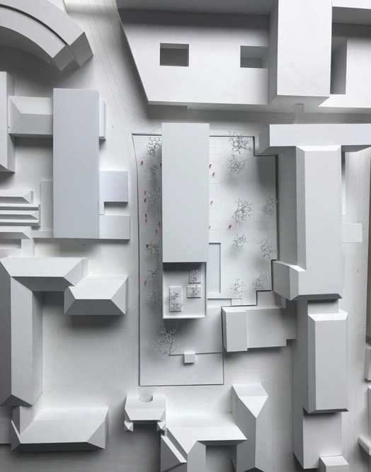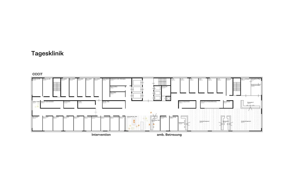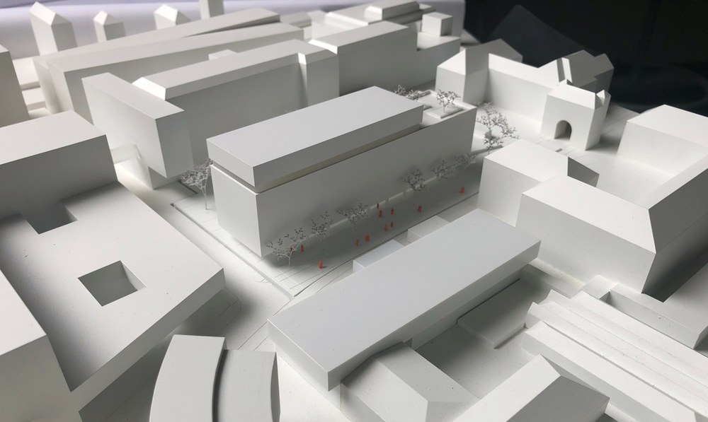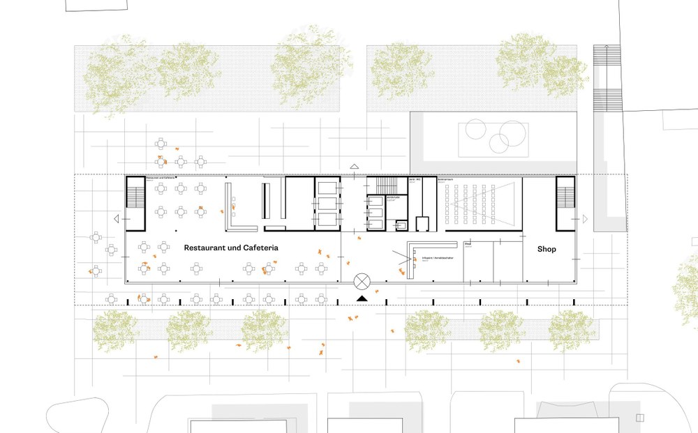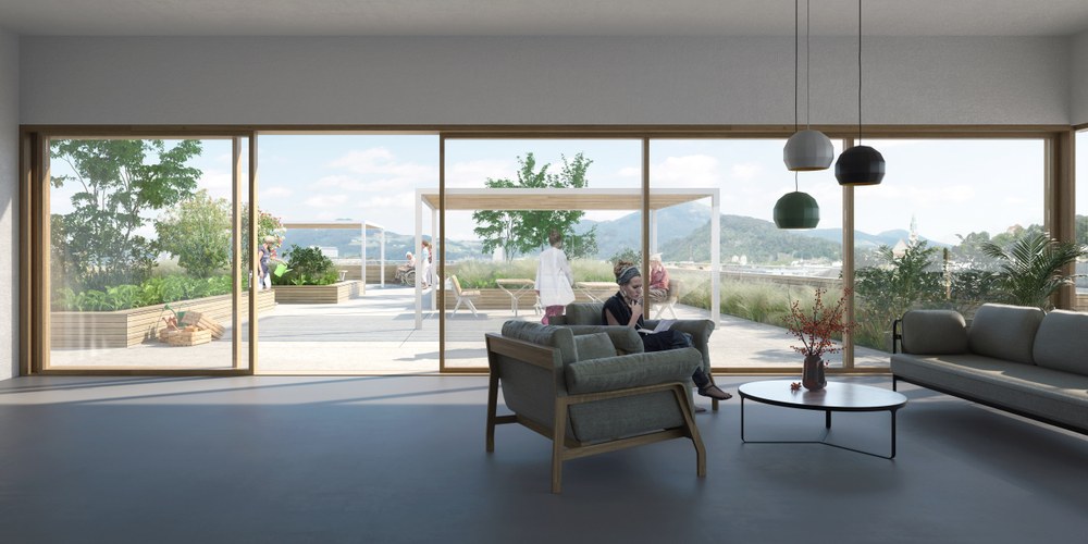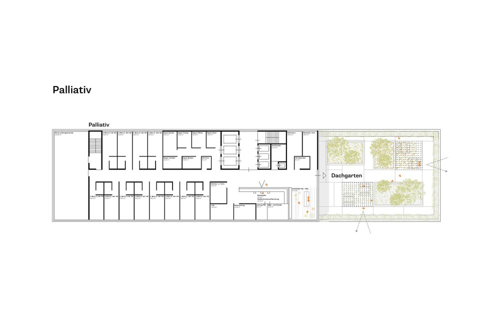 Die Müllner Hauptstraße wird als verkehrsberuhigte Begegnungszone mit hoher Aufenthaltsqualität ausgebildet und durch den gedeckten Freiraum der Onkologie zusätzlich aufgewertet. Durch den Rücksprung auf der Ost- und Westseite wird die Durchwegung zum nördlichen Nachbargebäude und Grünraum gestärkt.