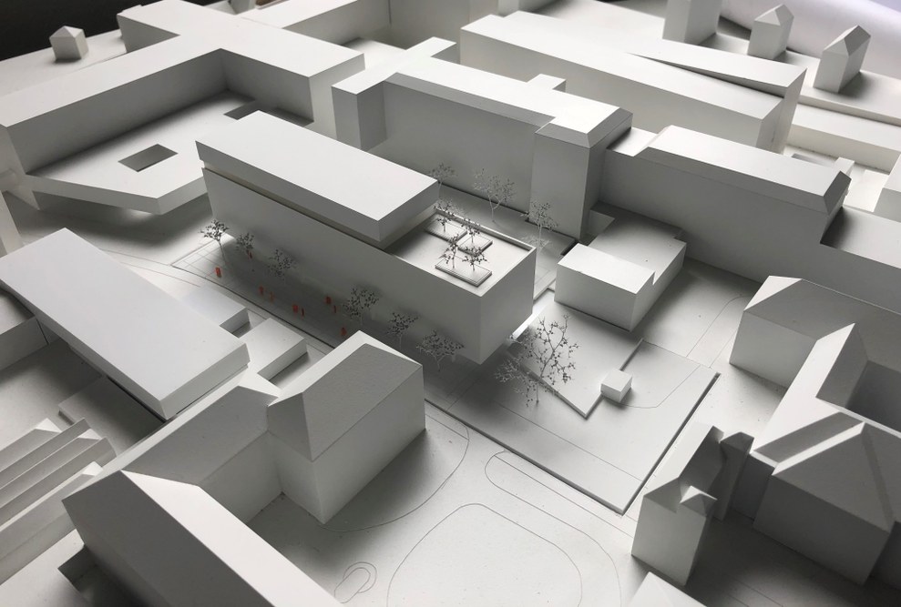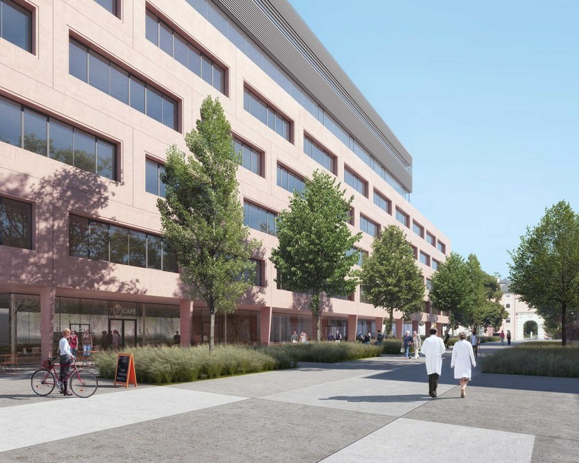 Der Neubau der Onkologie fügt sich an der Schnittstelle zwischen historischem Bestand und neuem Haus B mit seiner zurückhaltenden Architektur gut in die Umgebung ein. Durch die Staffelung von fünf Geschossen im Osten und sieben Geschosse im Westen erhält die Palliativstation eine großzügige Terrasse mit Blick Richtung Altstadt.