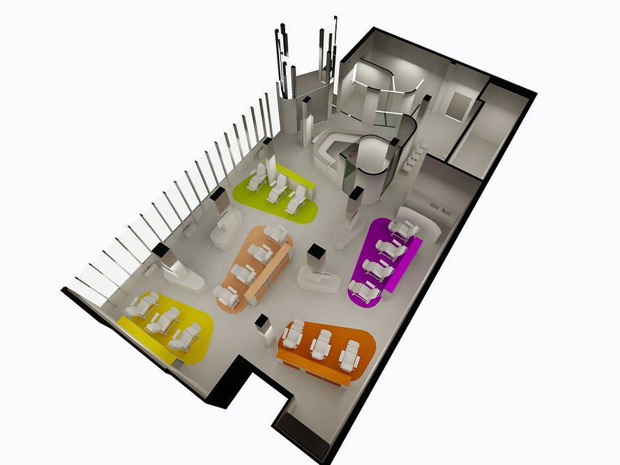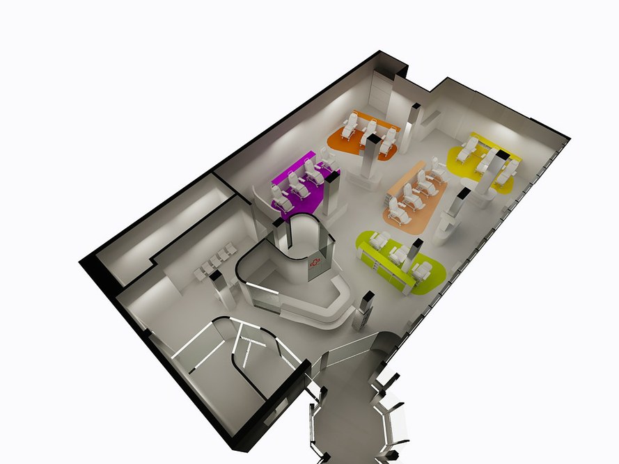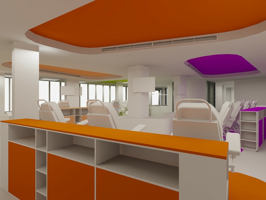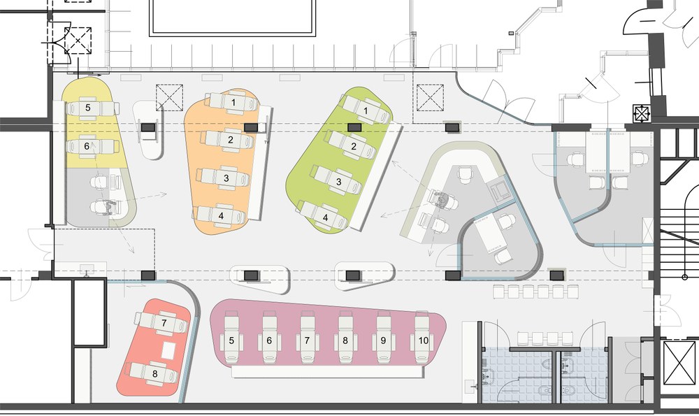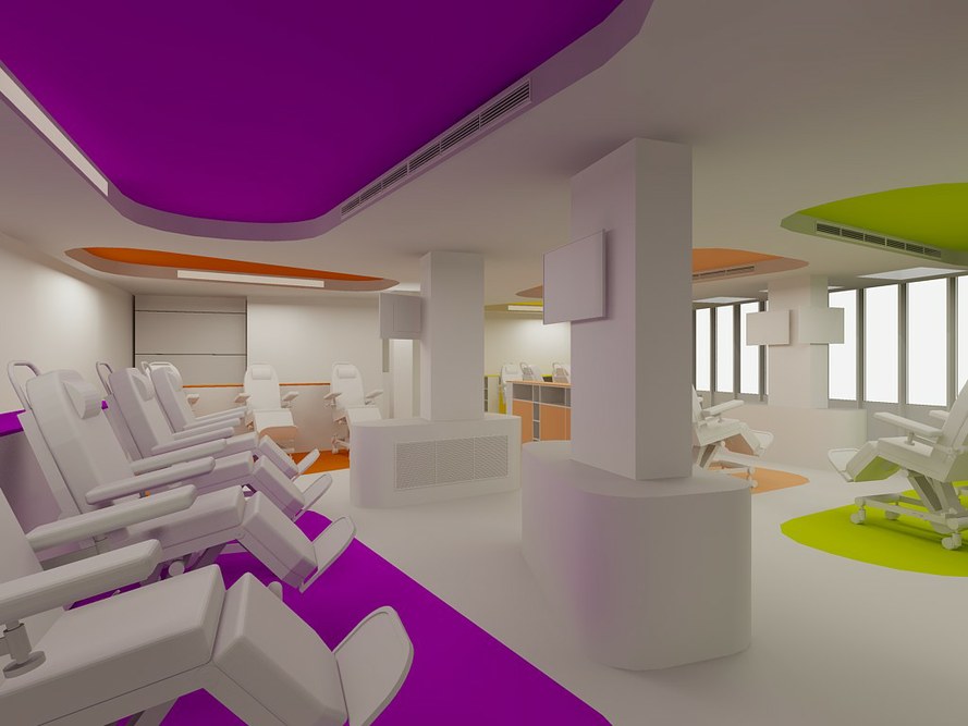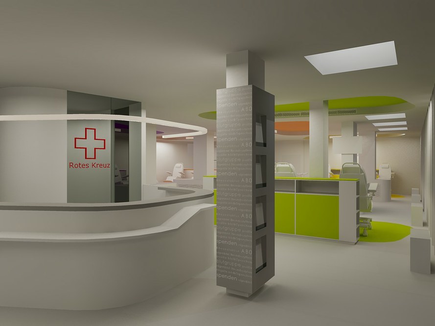 Das architektonische Innenraumkonzept sieht organische Grundformen der unterschiedlichen Blutabnahmebereiche vor. Es entsteht dadurch eine offene Gesamtlösung mit Inseln und fließenden Übergänge der einzelnen Bereiche und in der Wahrnehmung ein helles, großes Raumgefüge. Diese unterschiedlichen Bereiche werden durch starke farbliche Ausführungen im Bodenbelag, Deckenspiegel und Möblierung markiert und organisiert. Jedem Bereich ist ein in der Gestaltung neutraler Möbelblock zugeordnet in dem Haustechnische Anlagen, Infrastruktur und Unterhaltungsmedien untergebracht sind.