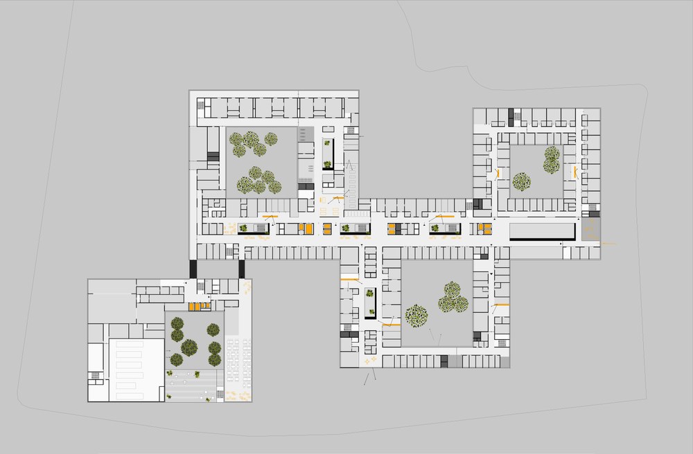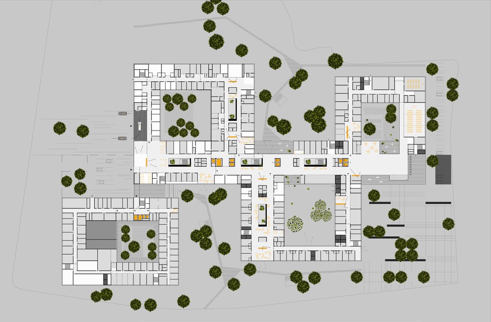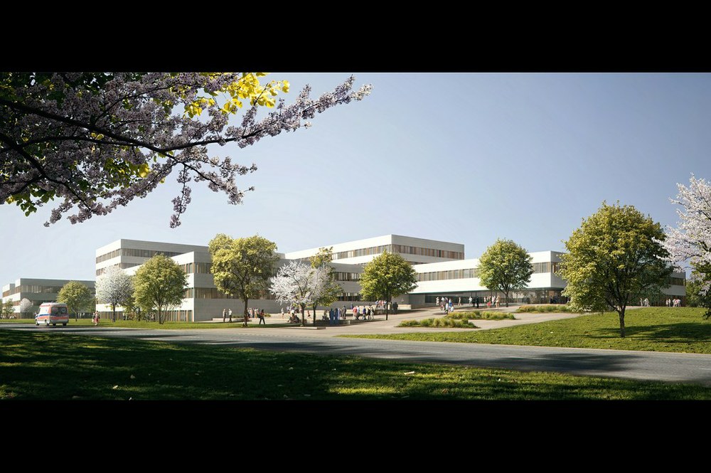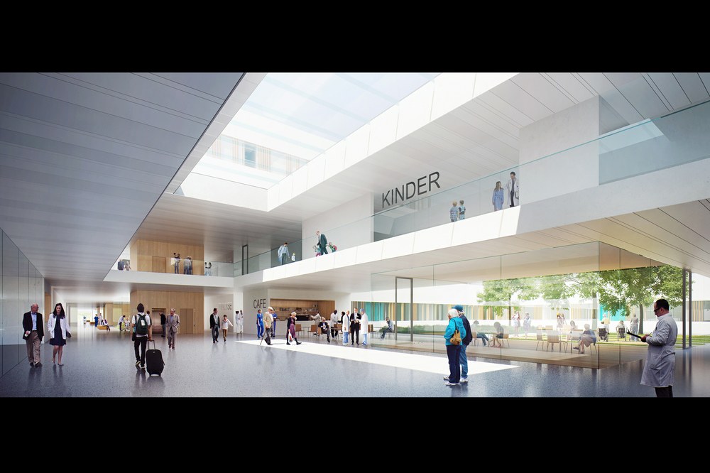 Drei rechteckige Baukörper mit großzügigen Atrien werden entlang einer linearen Magistrale versetzt angeordnet. Sie definieren und organisieren logisch die unterschiedlichen medizinischen Bereiche in den Ebenen E0+E1.