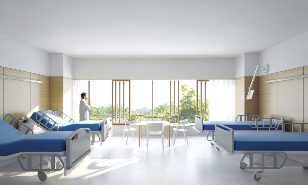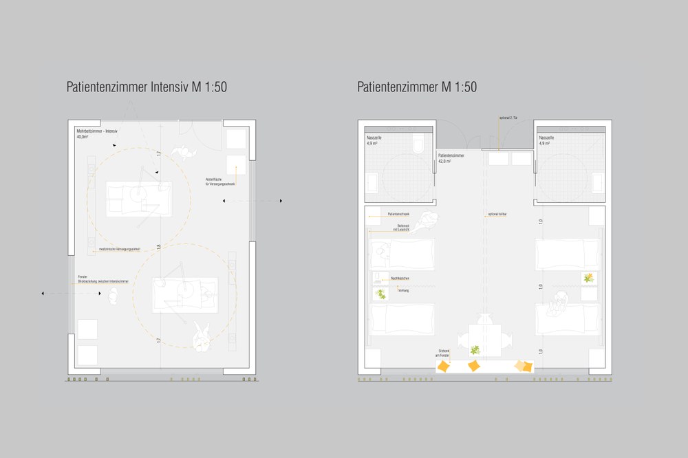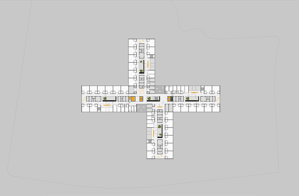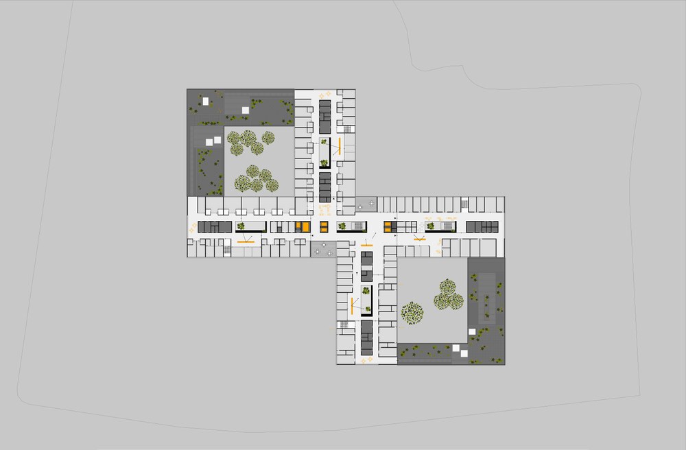 In den Bettenebenen E2+E3 werden die rechteckigen Baukörper als leicht versetzte Kreuzform aufgelöst, dadurch wird auch in der zentralen Verteilzone eine natürliche Belichtung mit Außenbezug ermöglicht.
