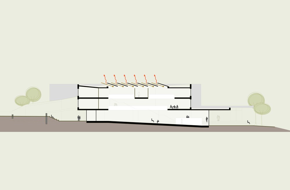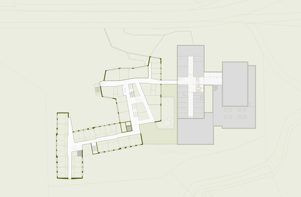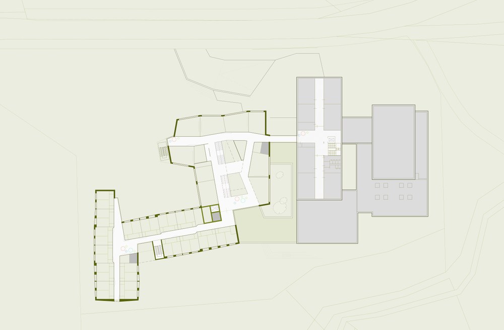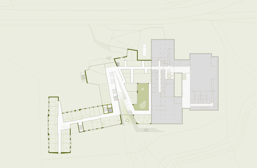 Auf die stark ausgeprägten Höhenunterschiede des Planungsgebietes und die diametrale Zutrittssituation (Straßenseite und Bachseite) wird mittels einer längsgeneigten Ebene als multifunktionale Zone reagiert. Die verdrehten Volumen und bewusst nicht streng orthogonal ausgerichteten Grundrisse und Querschnitte der Schul- und Praxisklassen verbessern die akustische Situation maßgeblich. Die Reflexion auf zeitgemäße pädagogische Konzepte bedarf frei angeordneter multifunktionaler Bereiche im fließenden Übergang mit der Erschließung.