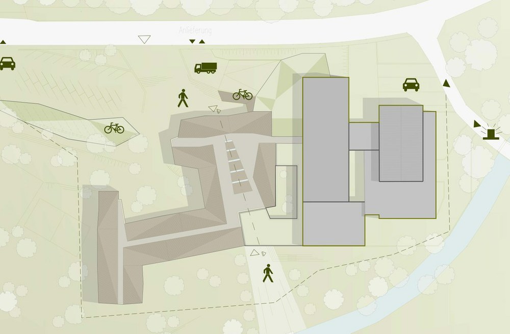 Die Assoziation zur Unregelmäßigkeit der Erdscholle ist im Entwurf durch geknickte Leitlinien und Flächen, welche sich vom Grundriss über die Fassaden bis hin zur Dachform und selbst im Innenraum widerspiegeln, spürbar.