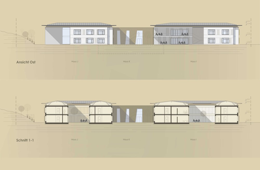 Die Dächer der vier neuen Hauptgebäude sowie der zu sanierenden Bestandsgebäude werden formal an die Dachform des Zubaus von 2007 (Haus E) angepasst und neu interpretiert ausgeführt. Die Dächer der Verbindungsgänge heben sich architektonisch durch Flachdächer von den restlichen Gebäuden ab.