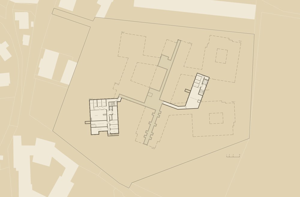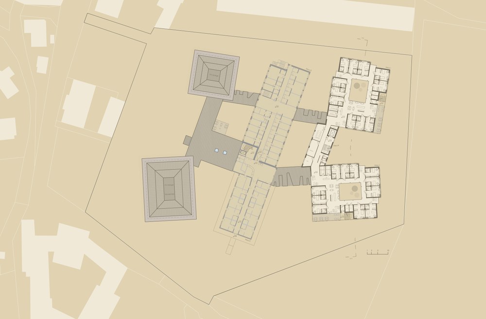 Die Aufteilung des Neubaus erfolgt auf vier einzelne Baukörper, zwei Verbindungselemente sowie drei Erschließungszonen.