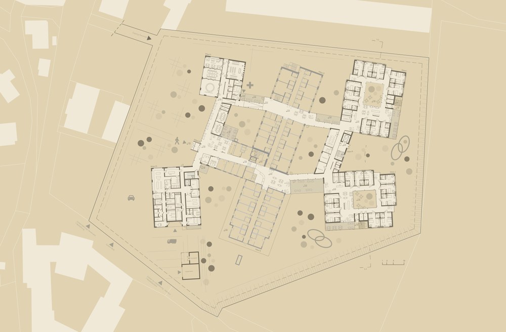 Ausgehend von der Wohlfühlzone der eigenen Wohneinheit, soll dem Bewohner die Möglichkeit zu einer schrittweisen Erweiterung seines vertrauten Lebensraumes über das gesamte Pflegeheim angeboten werden können. Wiederkehrende Elemente wie Gangerweiterungen, Einrichtungselemente sowie Wegführungen um Atrien sollen die Sicherheit und die Geborgenheit der Heimbewohner festigen.