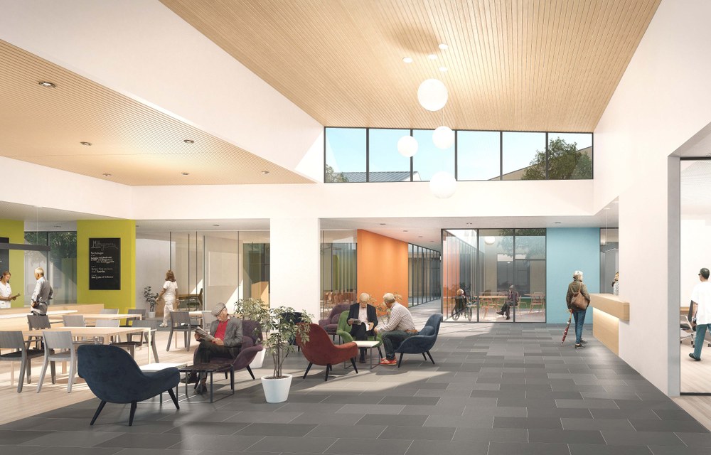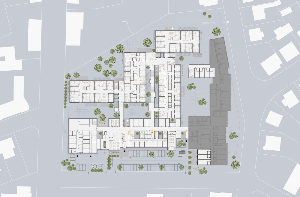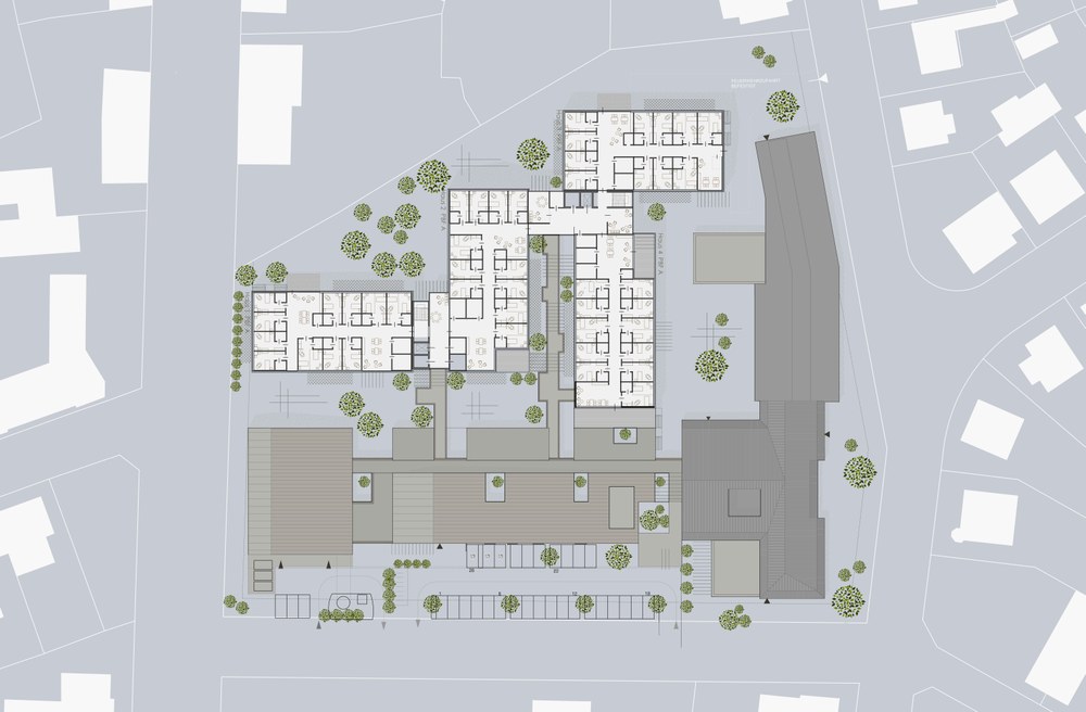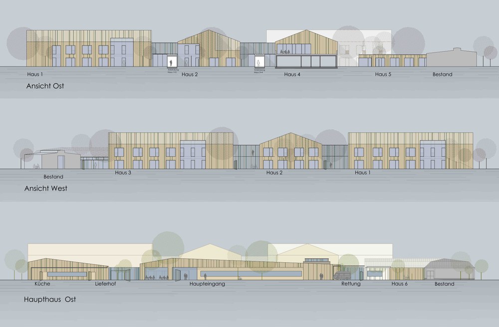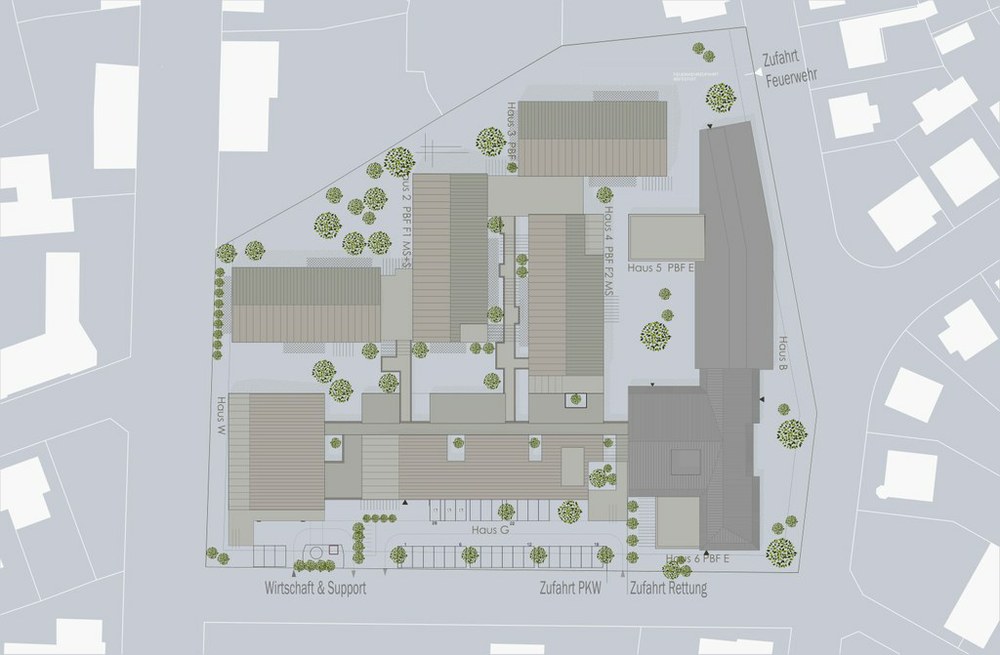 In vier Bewohnerhäusern sind jeweils 2 Pflege- und Betreuungseinheiten untergebracht. Die neunte Betreuungseinheit ist als Erweiterung der bestehenden Station konzipiert.